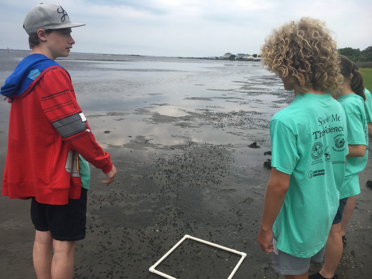 Last week, 47 middle school students from the Brad Sneeden Marine Science Academy received a lesson on estuaries and quadrant studies from the North Carolina Coastal Federation. The students went to Bogue Sound where they learned a bit more about how marine scientists evaluate living shorelines and marine life.